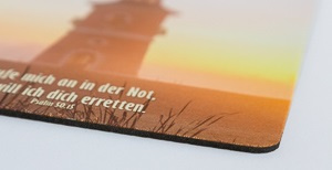 Das Motiv eines Leuchtturms bei Sonnenaufgang mit dem Vers 15 aus Psalm 50 "Rufe mich an in der Not, so will ich dich erretten." auf Ihrem Schreibtisch. Das praktische und strapazierfähige Mousepad ist sehr flexibel und kann unkompliziert mitgenommen werden.