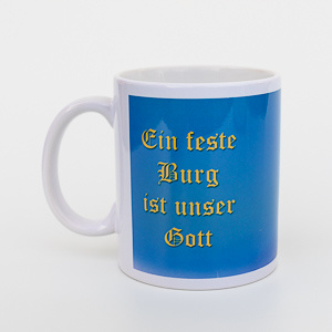 Die Fototasse ist in klassischer Becherform. Motiv außen ist die Wartburg bei Nacht und der Vers von Martin Luther "Ein feste Burg ist unser Gott"