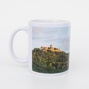 Die Fototasse ist in klassischer Becherform. Motiv außen ist die Wartburg bei Tag und der Vers von Martin Luther "Ein feste Burg ist unser Gott"