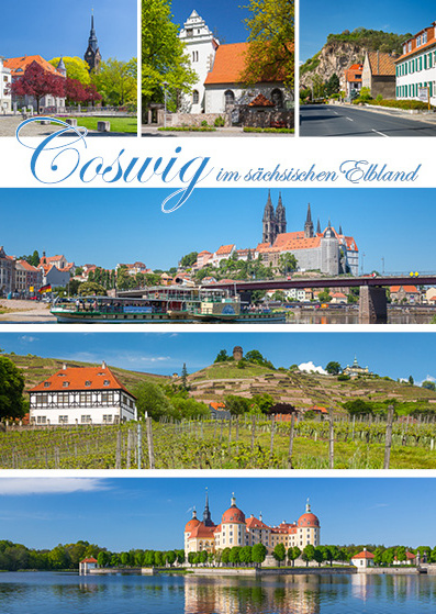 Auf dieser Postkarte sind mehrere einzelne Ansichten und Details von Coswig/Sa.