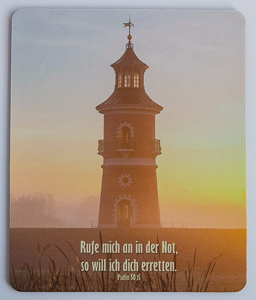 Das Motiv eines Leuchtturms bei Sonnenaufgang mit dem Vers 15 aus Psalm 50 "Rufe mich an in der Not, so will ich dich erretten." auf Ihrem Schreibtisch. Das praktische und strapazierfähige Mousepad ist sehr flexibel und kann unkompliziert mitgenommen werden.