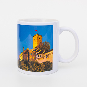 Die Fototasse ist in klassischer Becherform. Motiv außen ist die Wartburg bei Nacht und der Vers von Martin Luther "Ein feste Burg ist unser Gott"