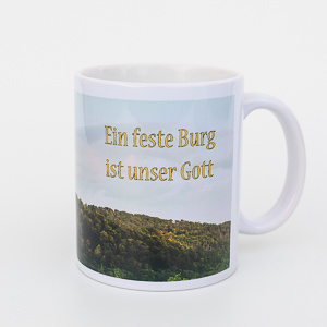 Die Fototasse ist in klassischer Becherform. Motiv außen ist die Wartburg bei Tag und der Vers von Martin Luther "Ein feste Burg ist unser Gott"
