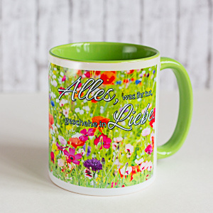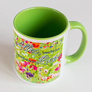 Die Fototasse ist in klassischer Becherform und hat außen Motiv und Vers der Jahreslosung 2024 aufgedruckt: "Alles, was ihr tut, geschehe in Liebe.". Sie können zwischen 2 Farben wählen.
